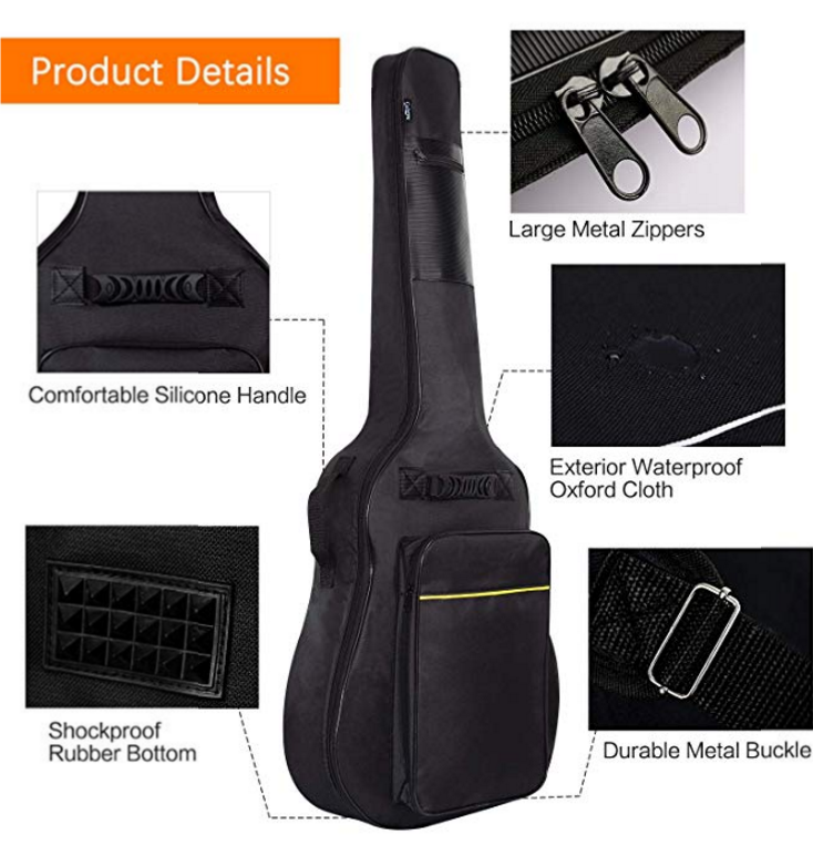 Dual adjustable shoulder straps + three handles for convenience. This new version guitar bag with back hanger loop can be hung on the wall for decoration.