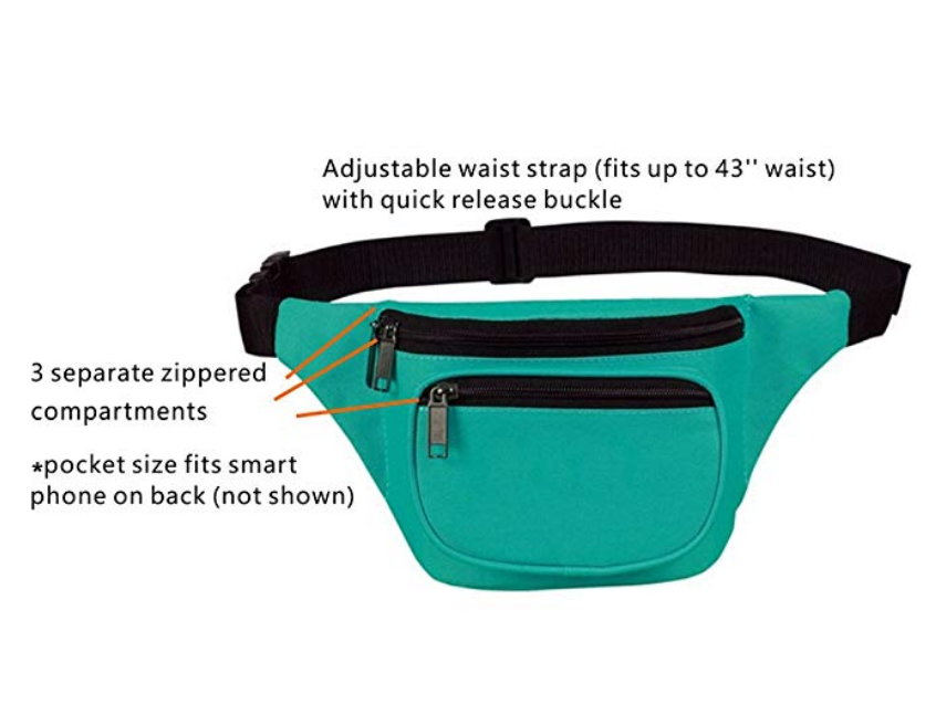 MODEL ITEM # H0001 Product Detail: Fanny pack features THREE (3) SEPARATE ZIPPERED pockets. Main pocket fits at least 3 iPhone 8 plus or 20 oz water bottle. Second outside pocket fits car keys, credit card and other small accessories. Hidden pocket on the back. This waist bag comes with quick release buckle and adjustable strap will FIT UP TO 44” in waist |
