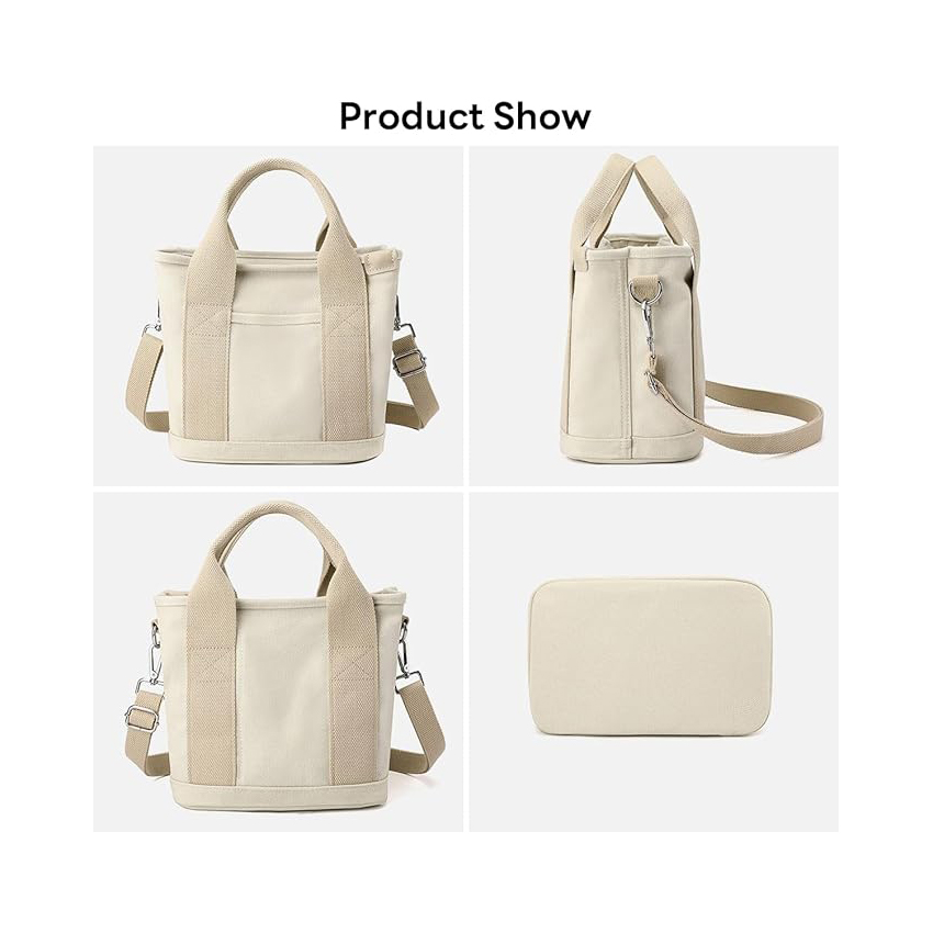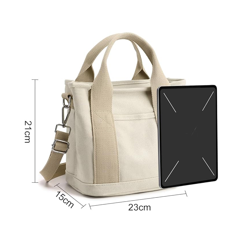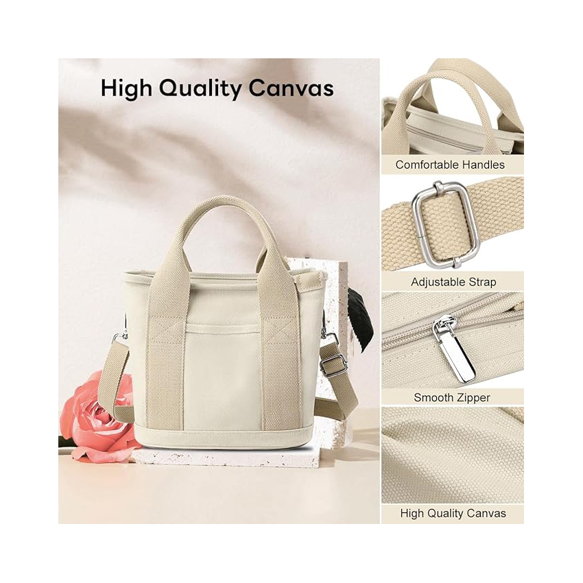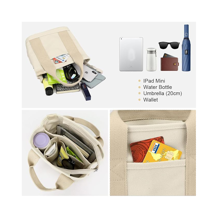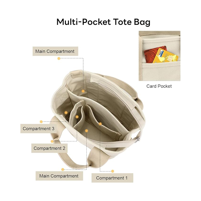 Multi Pocket Tote Bag with Zipper, Canvas Handmade Handbag Work Bag with Compartments, Multifunction Bag for Women Ladies Univisity School Shopping Travel Work Daily Use / Item# YH20-45