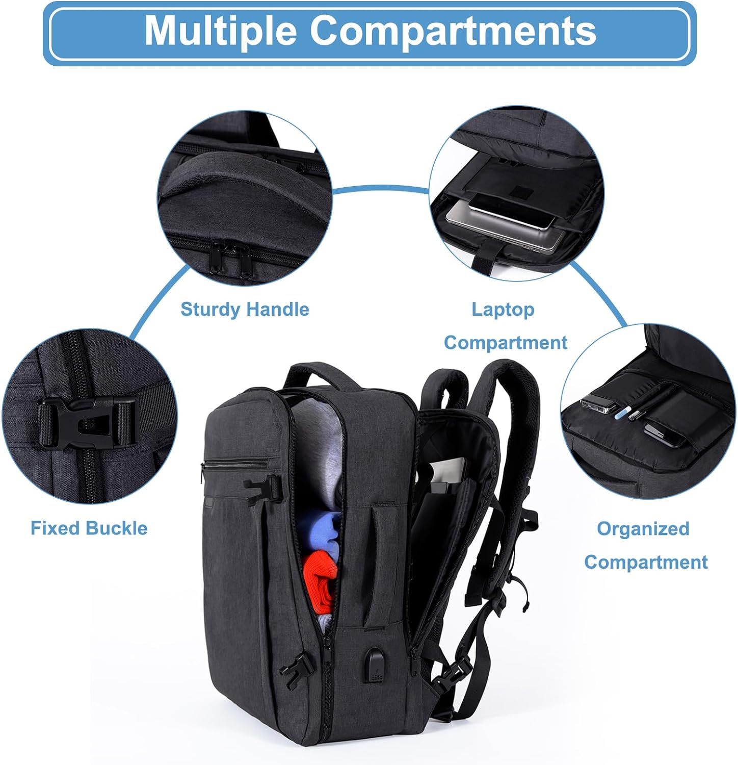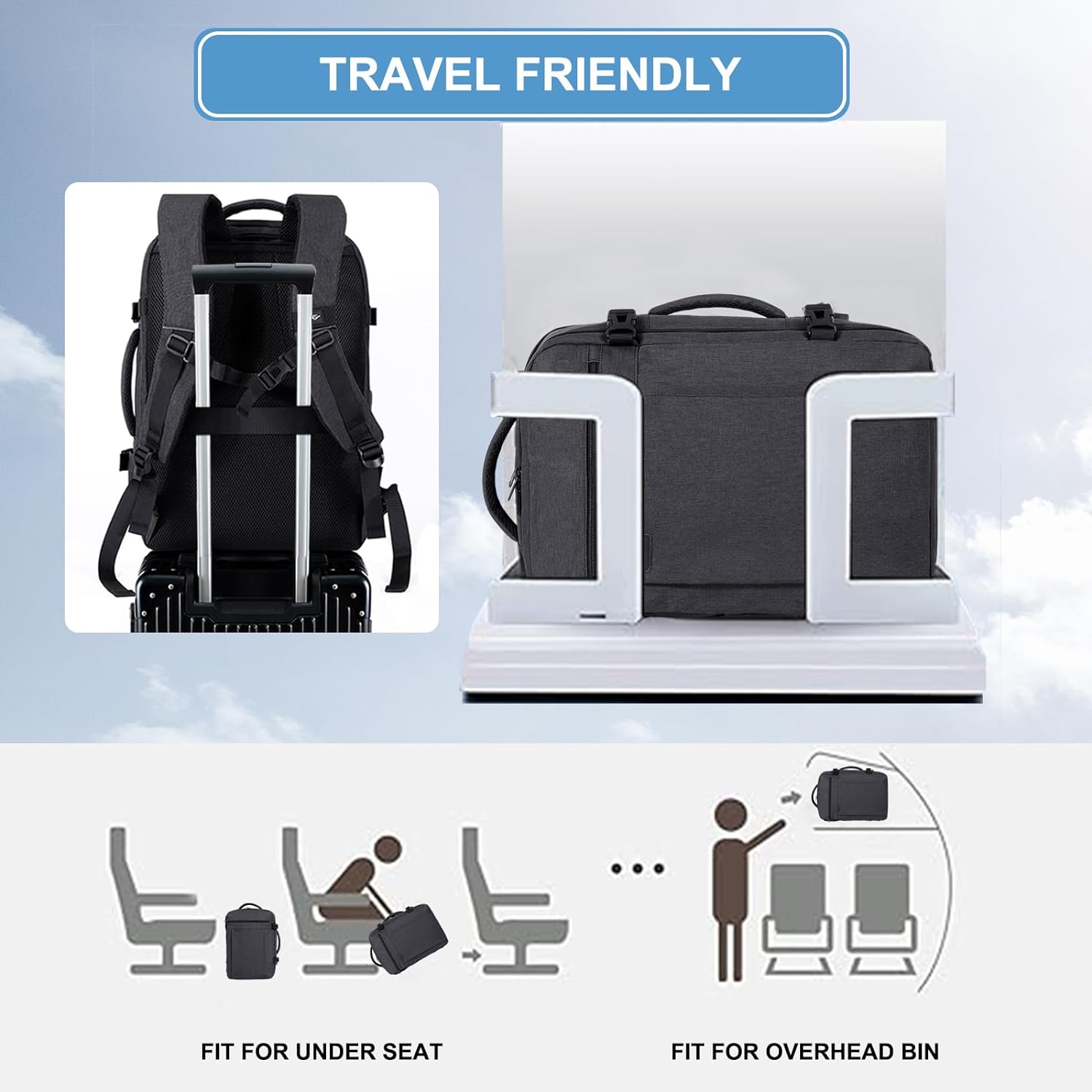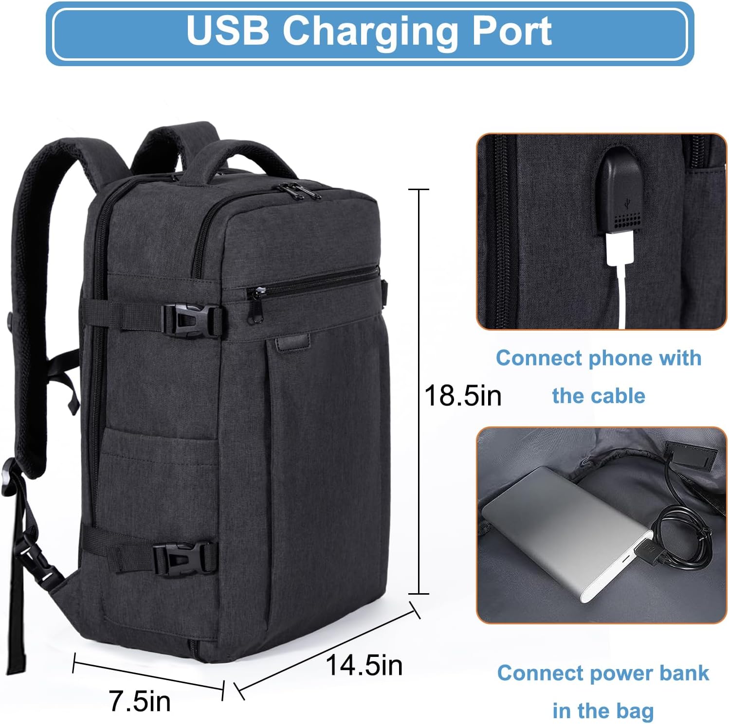【USB Charging Port & Durable Material】:USB interface design, it is very convenient to charge electronic devices by connecting your own power bank (charging cable included). The carry on laptop backpack is made of waterproof highquality nylon material and has large explosionproof zippers in the main compartment. (The backpack does not include a power bank)