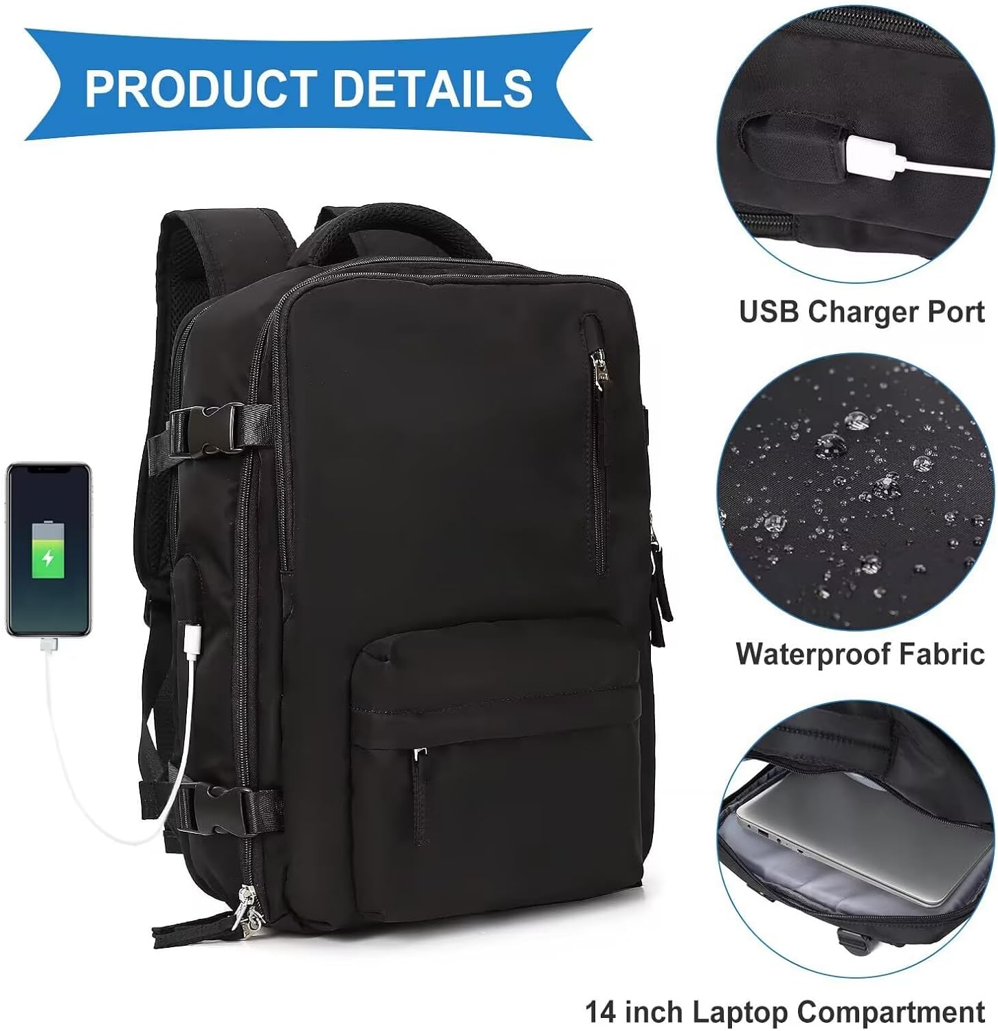Travel backpack size: 43x30x20cm /16.93x11.8x7.9 inches, 35L, travel backpack has multiple layers, can meet the needs of 3-5 days short distance or business travel. Back zipper anti-theft pocket to store valuables, such as mobile phones or cards, as well as other convenient inner pockets. These small designs keep your items clean and easy to find. [Great Travel Backpack] This backpack is made of durable waterproof polyester, has good breathability and heat dissipation, and comes with two padded shoulder straps for light carrying and strength enhancement, relieving shoulder pressure and keeping cool when worn for long periods of time. Hard, strong and colourless. The back pull bar cover is designed to secure the backpack to the trunk for hands-free transportation and carrying, making travel easier. [Separate shoe compartment and wet bag] A shoe compartment at the bottom of the backpack stores shoes, keeping them separate and everything else clean. There are two ventilation holes in the shoe compartment to keep it breathable and odorless. The flight-approved waterproof travel backpack front waterproof bag features a high-density waterproof material that can help you separate dry items from wet items such as wet clothes or towels. [USB charging and headphone port design] This USB backpack adds a unique charging port design, using a data cable to connect the mobile power supply in the backpack and an external phone, providing you with a more convenient way to charge your phone while walking. (Note: Mobile power and data cables are not included). [Multi-functional Outdoor backpack] This casual portable backpack is made of high-quality materials, more durable and stylish style, is the most suitable for personal items! You can also use it anywhere, such as international travel, university, camping, hiking or business, swimming. This is the perfect gift for men and women who love to travel, and a great choice for going back to college, Christmas, or other holidays. |