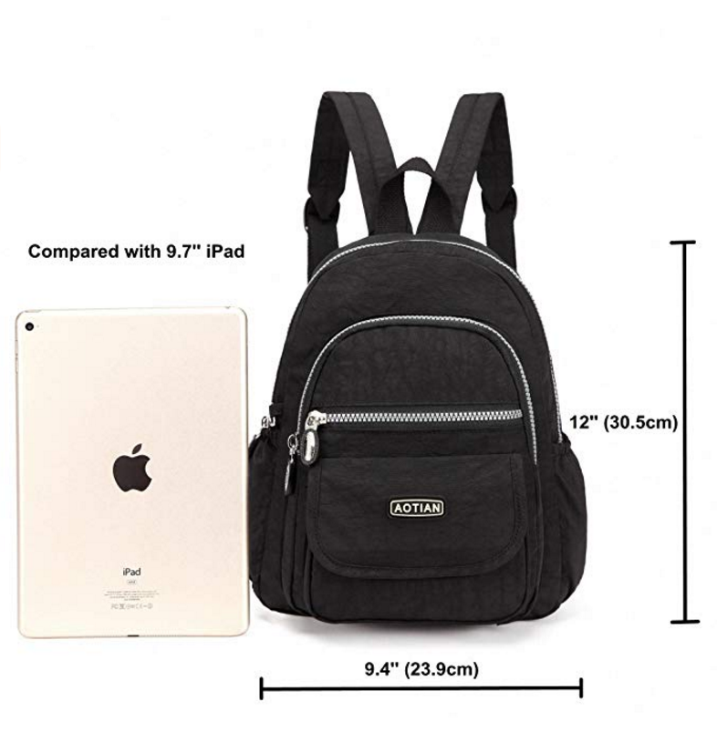 Model item # A0058 Product Detail: Fits 9.7'' iPad and note book (9.7 inches iPad shown in pictures for size reference). Back zipper pocket depth 9.2''. Protect your wallet, mobile phone and valuables Side pocketsside fits water bottle and Umbrella Material: Outside is high quality nylon, Lining is strong and sturdy PolyesterProduct Size: 9.4(L)x 12(H)x 4(W) inches |