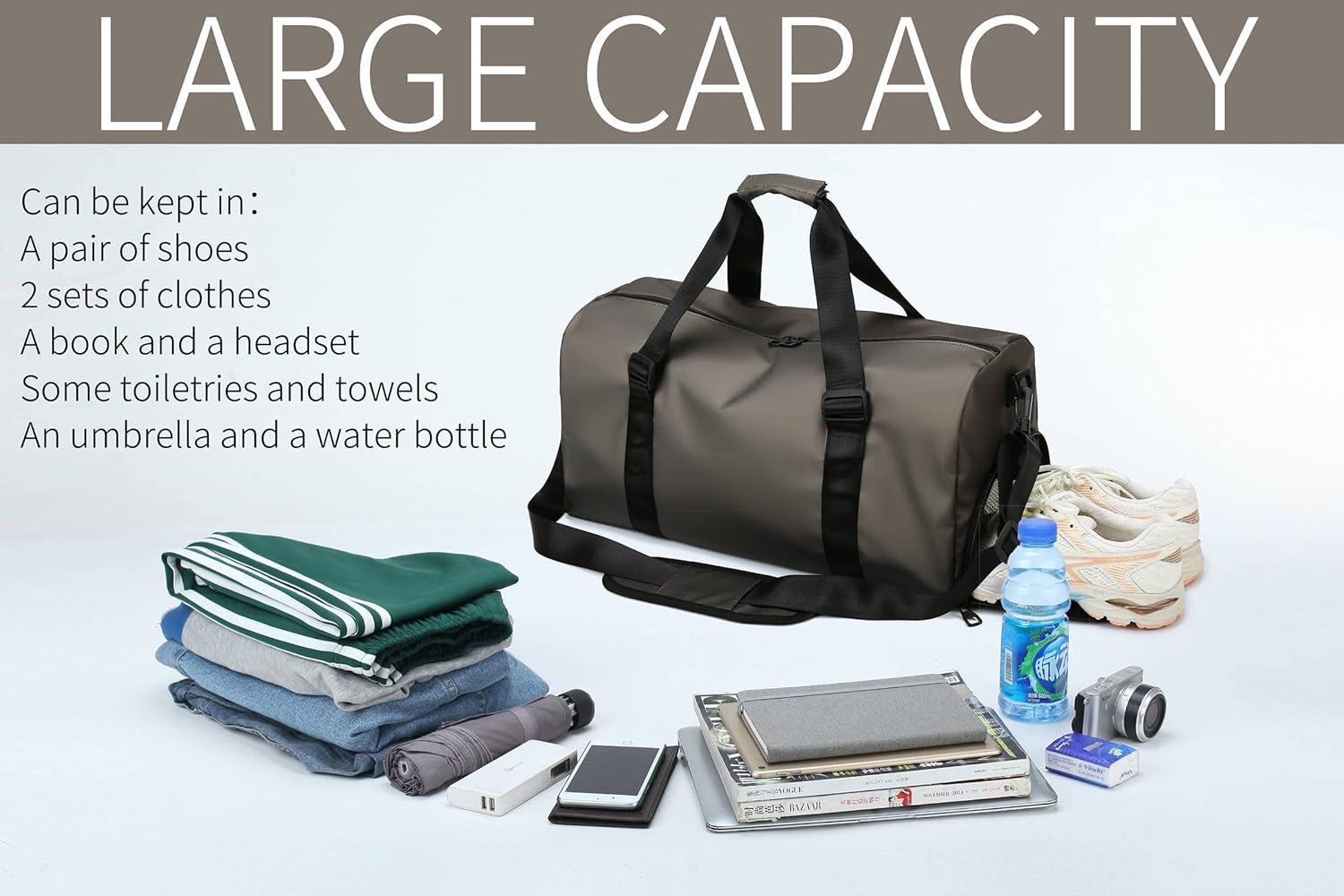 (2)This sports bag has a Shoe Compartment which can keeps shoes away from clean clothes or other belongings. A wet pockets for putting wet towels, wet clothes and shower gel inside. Besides, one internal security pocket to hold valuables stuff. Your item in holdall bag will be more secure and organized.