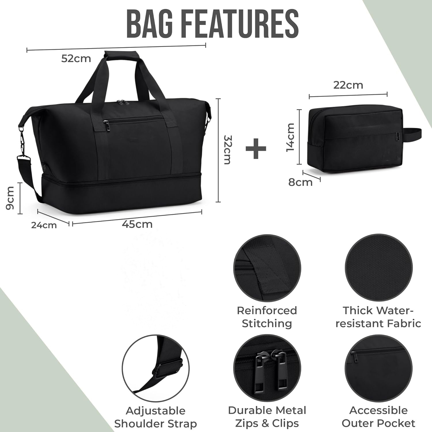 2.Our high capacity duffel bag set includes a toiletry/makeup bag and has a large shoe compartment that fits 2-3 pairs of shoes. Features 3 internal pockets, 1 internal wet pocket & 1 outer zip pocket. This optimises space while ensuring easy access, making it an essential for travelling.